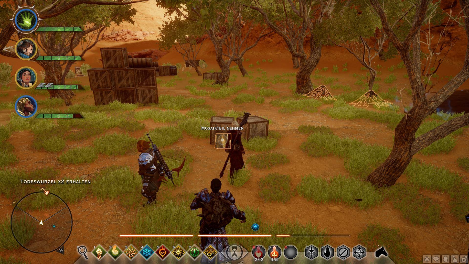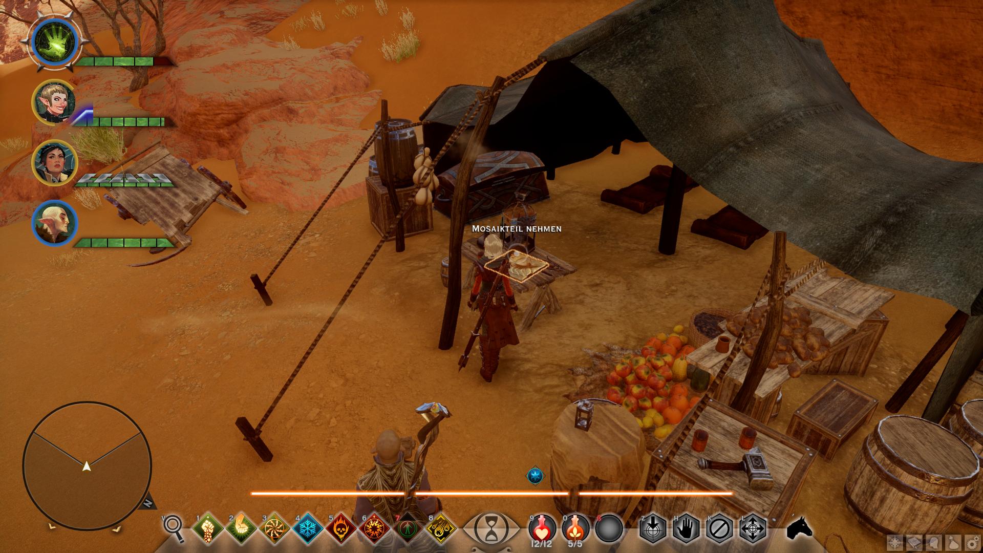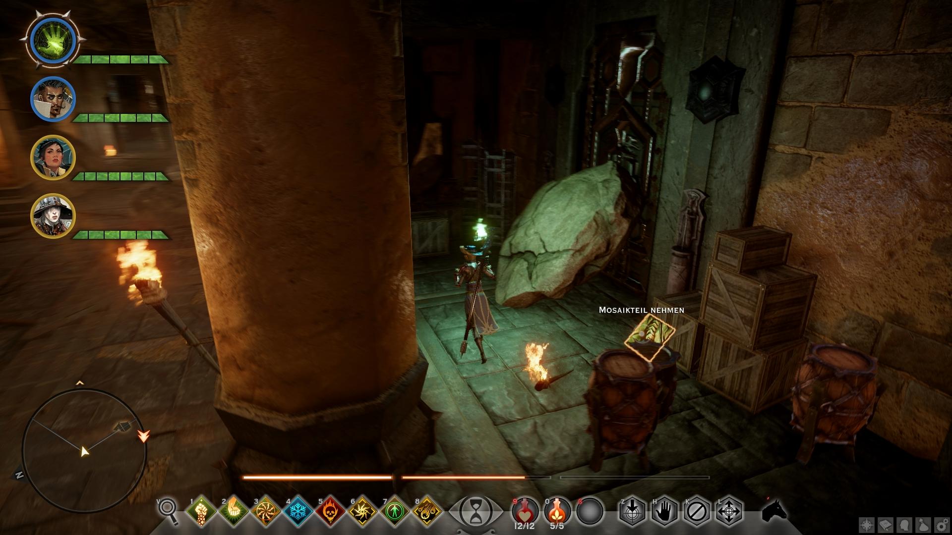 2. Das zweite Mosaikstück ist ähnlich leicht zu finden. Es liegt am Eingang der Stillen Ruinen. Falls ihr gerade erst das erste Mosaikteil eingesammelt habt, könnt ihr dem Verlauf der Sandfelsmine weiter folgen und gelangt so direkt vor die Stillen Ruinen. Dort gibt es eine Gruppe Venatori, welche die "Jagd auf die Tevinter-Reliquie" Quest startet. Hinter den letzten beiden Kisten auf der rechten Seite, noch vor der magischen Barriere, lehnt das Mosaikstück.