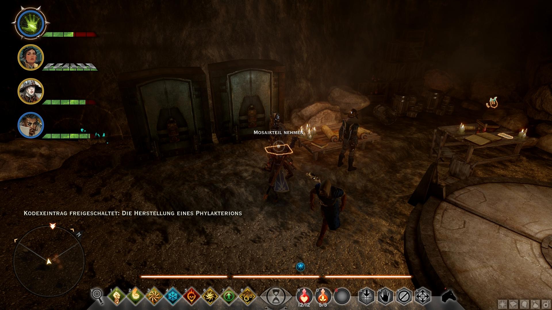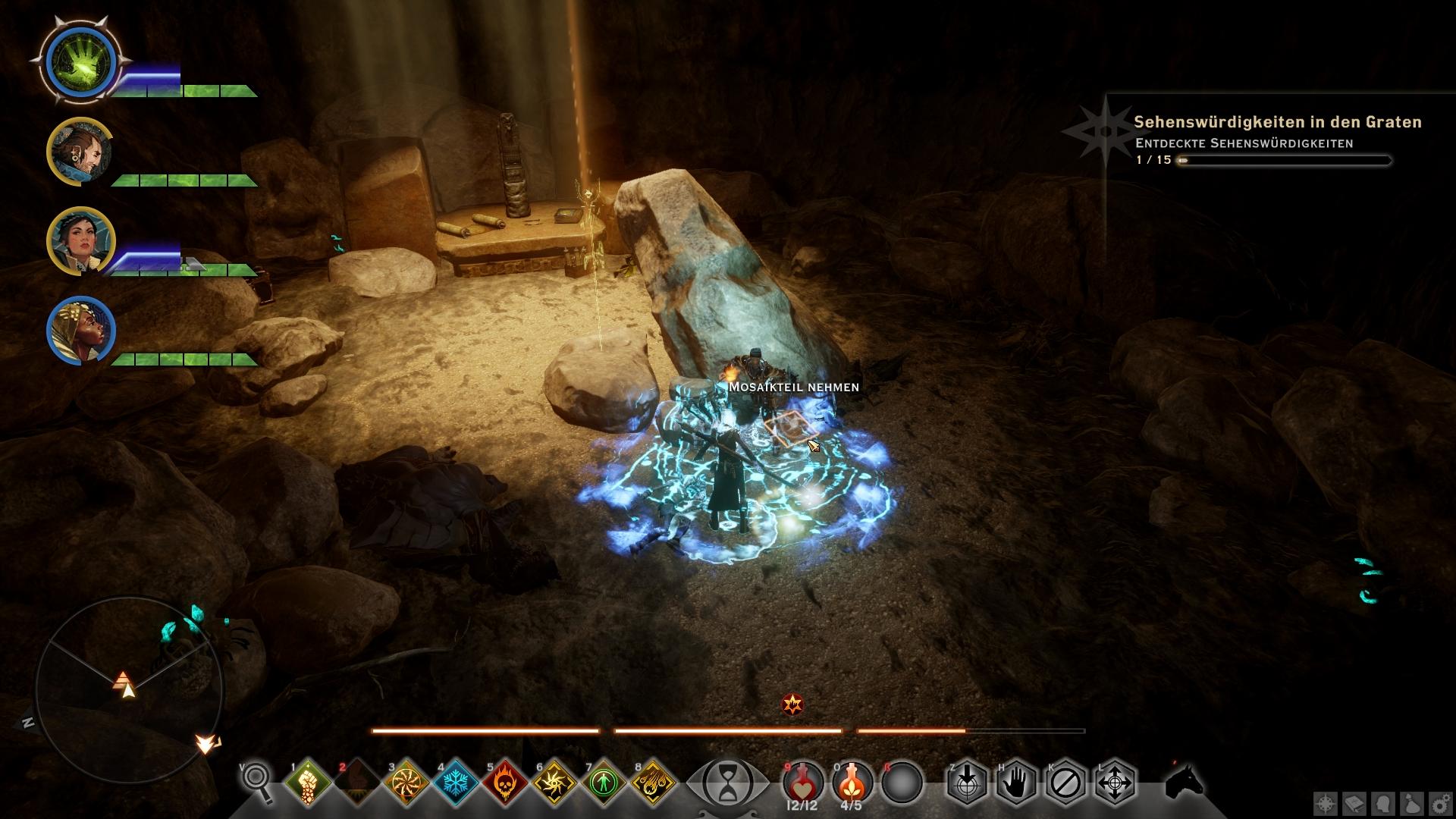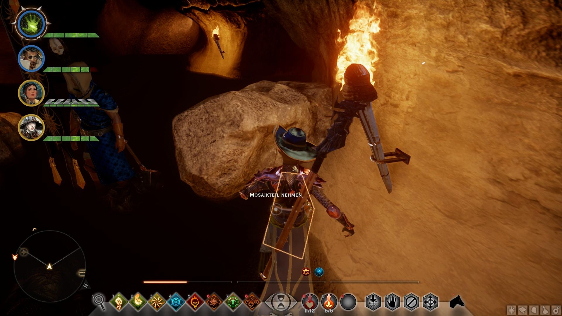 1. Das vermutlich erste Teil, über das jeder stolpert, liegt in der Sandfelsmine gleich westlich vom ersten Inquisitionslager (Lager in der Schlucht der verlorenen Quelle). Folgt schlichtweg dem Weg bis zu den Gefängniskarren, wo die Drakonologie Quest beginnt, geht von dort aus nördlich in die Höhle und nach wenigen Metern findet ihr das Mosaikteil auf der rechten Seite der Hauptkammer.