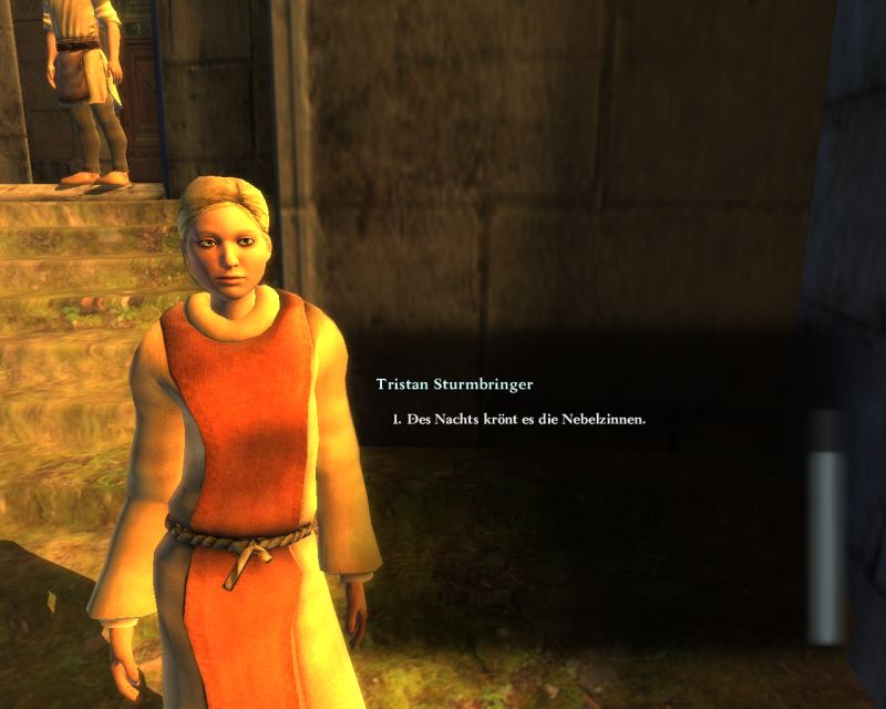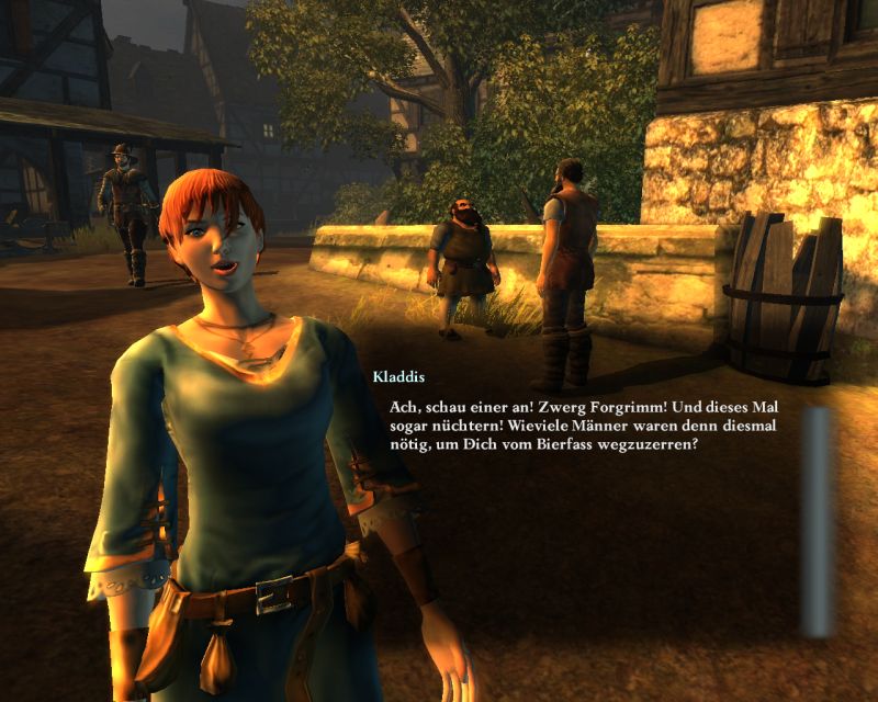 Da wir gerade hier sind, begeben wir uns am besten zum Tatort des Mordes an Eelko. Nach ein paar Metern merken wir, dass uns Goldzahn Jallik verfolgt, was dieser natürlich vehement leugnet. Kurz bevor wir am Tatort ankommen, werden wir plötzlich von einer jungen Frau angesprochen. Kladdis hat uns also gefunden.