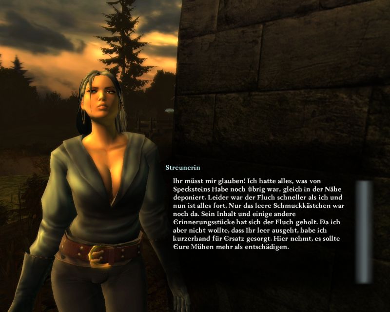 Sobald wir bezahlt haben, ist der Fluch gebrochen und Alricos Geist findet nun ebenfalls seine Ruhe. Thalya verabredet sich nun mit uns in der Taverne in Moorbrück, wo sie uns Specksteins Habe zurückgeben will. Als Vorschuss sollen wir den Rapier des toten Streuners an uns nehmen. Der Farfara-Rapier ist eine sehr gute Fechtwaffe (1W + 5; 25%-Chance Wunden zu schlagen) die wir uns auf keinen Fall entgehen lassen sollten.