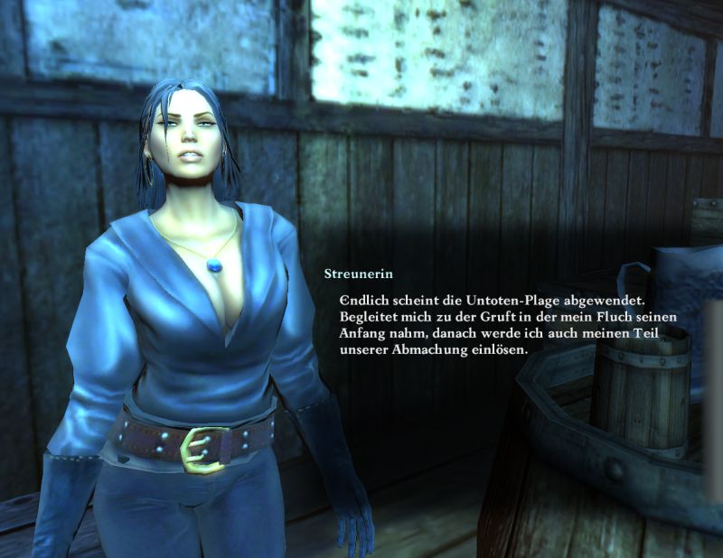 Haben wir den Auftrag angenommen, können wir die hustende Frau in der Taverne von Moorbrück auf das Problem ansprechen. Da Thalya bereits ahnt, dass wir in Specksteins Auftrag zu ihr kommen, redet sie gar nicht lange um den heißen Brei herum. Offenbar hat sie Specksteins Schatulle nur deshalb gestohlen, weil sie sich selbst in einer misslichen Lage befand. Da sie sich immer noch in dieser misslichen Lage befindet, bietet sie uns einen Handel an. Wie es scheint, hat sich Thalya bei einem ihrer Beutezüge eine verfluchte Halskette eingehandelt, die sich nun nicht mehr abnehmen lässt. Da sie alleine zu schwach ist, sollen wir ihr dabei helfen die Kette zurück in die Grabkammer zu bringen, aus der sie das Schmuckstück damals entwendet hatte. Wie zu erwarten, handelt es sich um eine alte Gruft in Moorbrücks Sümpfen. Danach will sie uns Specksteins Schatulle gerne wieder zurück geben.