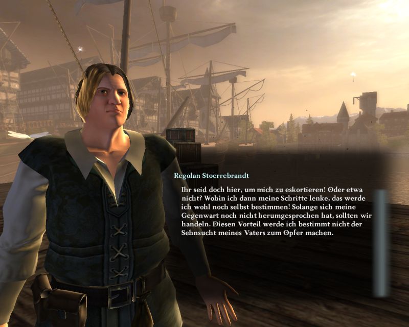 Laran Deikmolder erklärt uns nun, dass fortan Regolan Stoerrebrandt die Führung über das Handelshaus übernehmen soll. Da er gerade erst am Hafen angekommen ist, sollen wir uns zum Pier begeben (wo Ardo ermordet wurde) und ihn sicher zum Lagerhaus geleiten.
