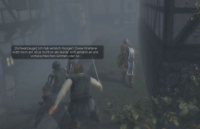 In Fuhrmannsheim angekommen, kann man aufgrund des plötzlich aufkommenden Nebels kaum noch die Hand vor Augen sehen. Unser Ziel ist es nun das Treffen zwischen den Anführern der Schwarzaugen und der Neisbecks zu belauschen. Nun gilt es uns bloß nicht erwischen zu lassen. Schlägt einer der Schwarzaugen Alarm bekommen wir es nicht nur mit den Patrouillen zu tun, sondern auch mit den Schwarzaugen, die sich in der "Sanften Sau" befinden.