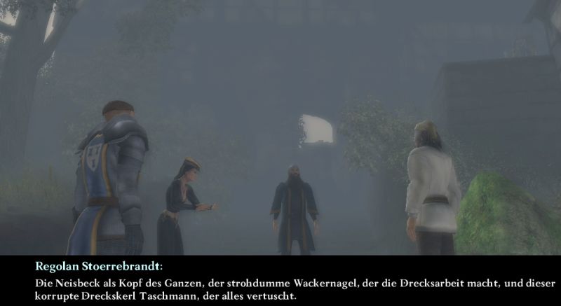 Hier können wir nun Frau Neisbeck, Obergardist Taschmann, den Anführer der Schwarzaugen und einen seltsamen Magier beobachten. Nachdem Regolan gesehen hat, was er sehen wollte, geht es schleichend den ganzen Weg wieder zurück zum Tor und ins Hafenviertel. Nun ist Regolan auch bereit mit uns zum Lagerhaus zu gehen, wo wir mit 25 Dukaten belohnt werden.