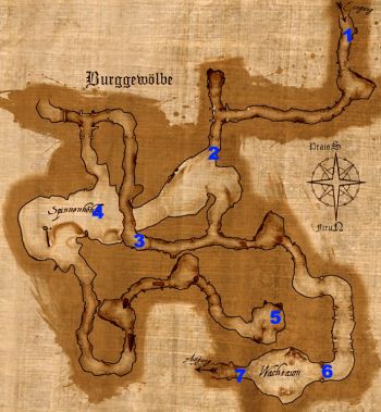 Legende: (1) Eingang (2) Orks vs. Spinnen (3) Gang mit Holzpalisaden zur Spinnenhöhle (4) Spinnenhöhle (5) Orkgespräch (6) Eingang zum Wachraum (7) Aufgang zur nächsten Ebene