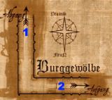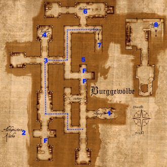 Am besten schlägt man sich vom Eingang zur geheimen Alchemistenküche durch und wartet dort, bis der Hundeführer Richtung Eingang marschiert. Danach folgt man dem Gang nach Norden zur Werkstatt und wartet bis sich der Hundeführer wieder in den südlichen Teil dieser Ebene begibt. Danach hat man genug Zeit, um den Geheimraum (5) zu plündern und an dem Wachraum vorbei über den Aufgang (7) in die nächste Ebene zu gelangen.