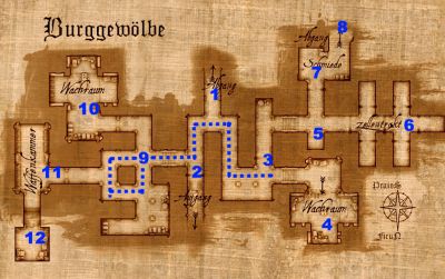 Legende: (1) Eingang (2) Gittertür (Schalterrätsel bei 4); Aufgang (3) Gittertür (Schalterrätsel bei 4) (4) Schalterrätsel für die Gittertüren bei 2 u. 3 (5) Schalter zum Öffnen der Zellen (6) Zellentrakt (7) Schmiede (8) Abgang zur Ebene 2 (9) Patrouilliernder Hundeführer (10) Wachraum (11) Waffenkammer (12) Geheimer Teil der WaffenkammerNachdem man die dritte Ebene des Burggewölbes erreicht hat, gilt der Auftrag "Schleiche dich an den Orks vorbei" als erledigt. Für ein paar Extra-Abenteuerpunkte kann man nun wieder in die 2. Ebene steigen und den Hundeführere und die Orks im Wachraum töten.