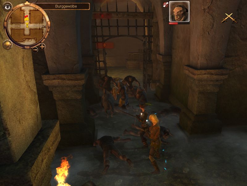 Im Wachraum warten ein Oger und zwei Orks auf uns. Da wir mit diesen Gegnern nun schon einige Erfahrung sammeln konnten, sollte der folgende Kampf keine größere Herrausforderung mehr darstellen. Sind die Gegner besiegt, verlassen wir über die Treppe den Geheimgang, um ins eigentliche Burgverlies zu gelangen.