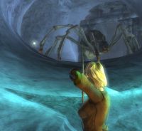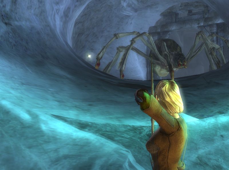 Wir betreten nun die unterste Ebene der Burg. Folgen wir dem Tunnel, bis wir zur ersten T-Kreuzung gelangen und wenden uns nach links. Wir gelangen in eine kleine Höhle, in der sich Orks mit einigen Smaragdspinnen einen Kampf liefern. Nachdem wir uns um den/die Überlebenden gekümmert haben, folgen wir dem Gang weiter zur nächsten T-Kreuzung. Wenden wir uns nach Westen, gelangen wir durch einen Gang in eine große Spinnenhöhle, in der wir es mit einigen kleinen und einer großen Smaragdspinne zu tun bekommen.