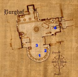 Nachdem er uns seinen Schatz ausgehändigt hat, beschließt der Ritter bei Graf Growin Bericht zu erstatten und in der Grafenresidenz auf uns zu warten, falls wir seine Hilfe in Anspruch nehmen möchten. Wir verlassen ebenfalls den Burghof (4), um zum Hesinde-Tempel nach Ferdok zu reisen.