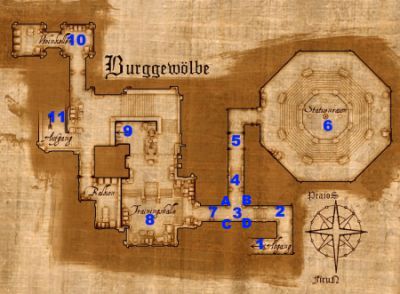 Legende: (1) Abgang zu Ebene 3 (2) Speerfalle (3) Schalterrätsel (4) Orks und mehrere Fallen (5) Gang zum Statuenraum mit Fallen (6) Statuenraum und Fundort des Auge des Drachen (7) Verschlossene Holztür zum Trainingsraum (8) Trainigsraum mit Orks (9) Abgang zu kleinem Lagerraum (10) Weinkeller (11) Aufgang zum Burghof (A,B,C,D) Fackelhalter