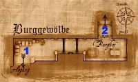 Legende: (1) Abgang zu Ebene 4 (2) Ausgang zum BurghofWir laufen die Treppe nach oben und gelangen über eine kleine Zwischenebene zum Burghof. Bevor wir nun endgültig den Burghof betreten, sollten wir uns versichern nichts wichtiges vergessen zu haben, denn es wird keine Möglichkeit mehr zur Rückkehr in das Burggewölbe geben.