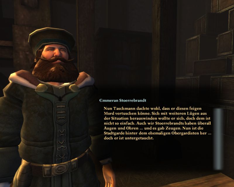 Ulwine möchte, dass wir den gierigen Hauptmann der Stadtwache Taschmann beseitigen. Hier geht es wohl nicht nur um Geld, sondern auch darum, dass Taschmann zu viel über die Verwicklungen der ehrenwerten Familie in den Mord an Regolan Stoerrebrandt weiß. Bevor wir aufbrechen erhalten wir ein Giftfläschchen, mit dessen Inhalt wir Taschmann erledigen sollen.