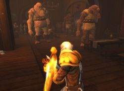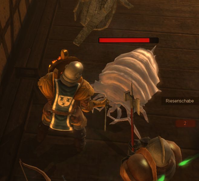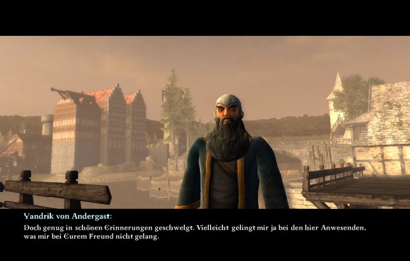 Es kommt nun wie es kommen muss und wir beweisen dem sadistischen Magier aus Andergast unsere Fähigkeiten im Kampf. Hilfreich im Kampf gegen Magier erweist sich das Talent Niederwerfen, gegen das sich auch Yandrik als anfällig erweist. Zwingt man ihn in die Knie, macht der Magier einen Abgang über den Rand des Stegs ins Wasser.
