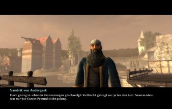 Dem Hauptmann wird nach dem schlecht bekömmlichen Gebräu übel und er verlässt den Schankraum. Wir verlassen ebenfalls die Schenke und folgen Taschmann der sich zum Bootsanleger schleppt. Auf dem Steg angekommen folgt ein Dialog mit Taschmann, indem wir einige eindeutige Hinweise auf Ardos wirklichen Mörder bekommen.