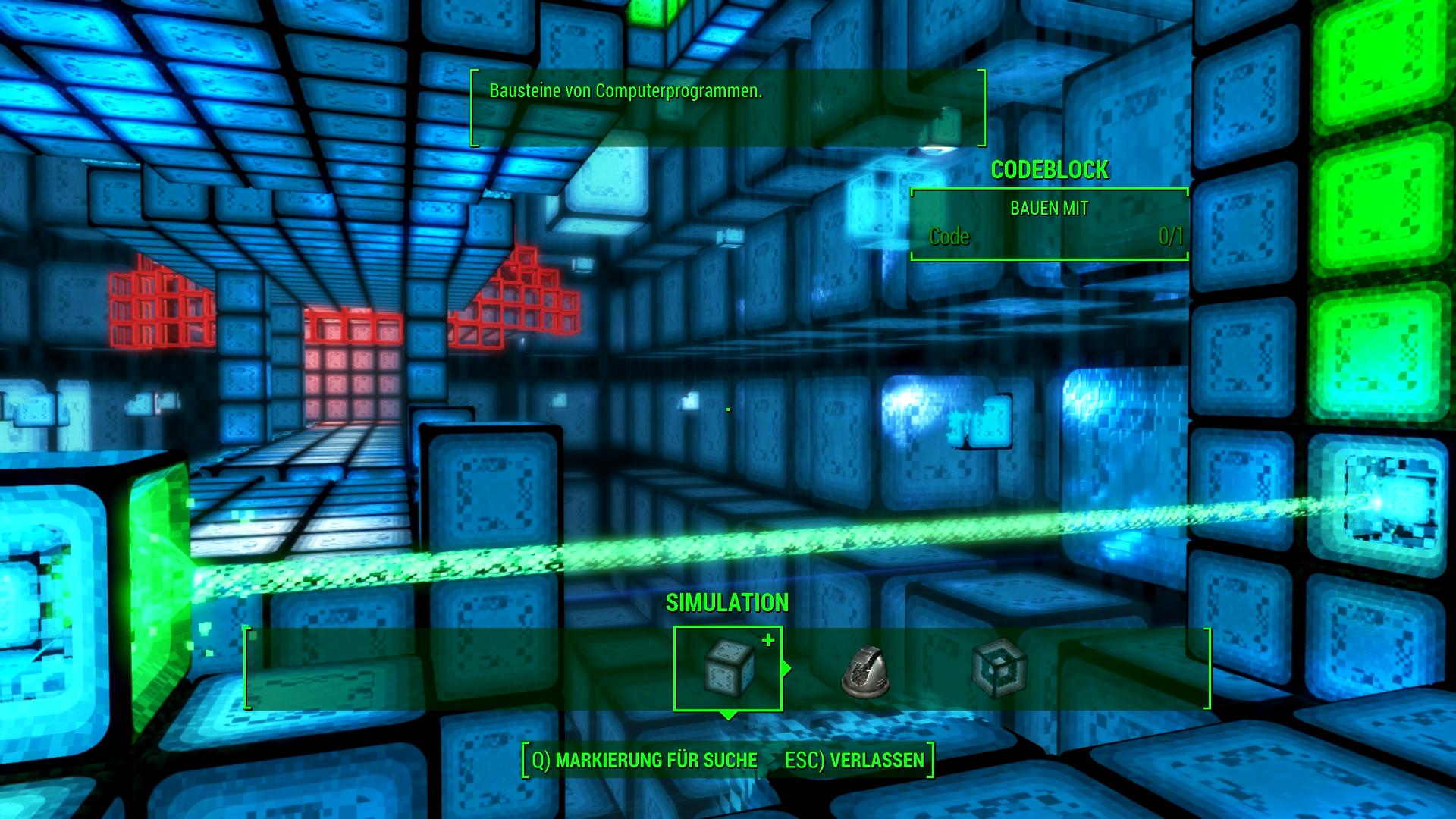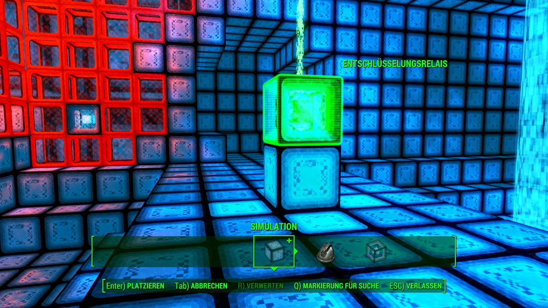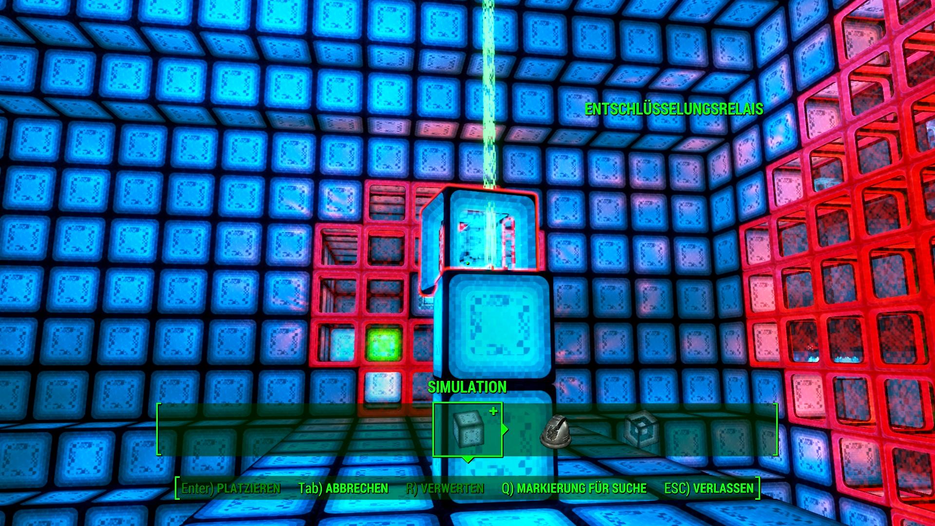 - Setzt nun einen einzigen Codeblock an andere Ende des Ganges und das zweite Entschlüsselungsrelais darauf. Es muss so gedreht sein, dass es den Strahl um 90 Grad versetzt nach rechts auf die grüne Datenleitung umlenkt. Das zerstört die letzte Firewall.