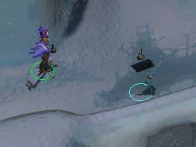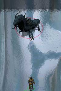 Etwas weiter den Weg runter, treffen wir auf die Auriliten, die uns vorhin schon angegriffen haben. Hier befinden sich einige aufgeschichtete Steinhaufen. (2) Um die Wirkung zu testen, ziehen wir an einem der Hebel. Die fallenden Steine des mittleren Haufens, beschädigen die Eisschicht, die um einen der gefrorenen Soldaten liegt. Dadurch wird ein Amulett frei gelegt, welches er in Händen hielt. Schnell machen wir uns auf den Weg, das Amulett zu holen und zu untersuchen. Es handelt sich hier um ein Aurilite-Symbol. Sobald wir das Symbol aufgehoben haben, greifen uns die Doom Guards an. Eine der Guards, mit Namen Vrassillus hinterlässt den Morgenstern Flaming Star +1, welcher zusätzlichen Feuerschaden verursacht. Mit dem gefundenen Amulett sind wir nun endlich in der Lage Türen zu öffnen, was jedoch immer einen Eispfeil auf den Plan ruft. Hinter einer Türe befinden sich einige Rehe und eine grosse Spinne, die Aocha heisst. (3) Da diese Spinne sich nicht feindlich verhält, lassen wir sie in Ruhe.