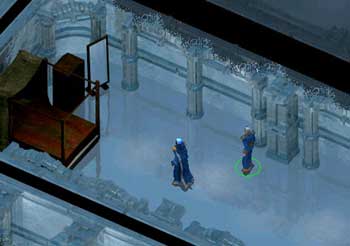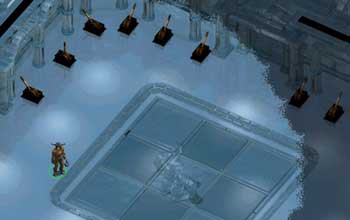 Unten angekommen, stehen wir erst mal in einem Flur, der von einem Auriliten bewacht wird. Gehen wir in den Quergang, treffen wir dort einige Barbaren Krieger, noch mehr Auriliten, Polar Bären und andere Gegner. Am besten leert man mal die Gänge von diesen Störenfrieden. Das kann man auf die normale Art machen, indem man einen nach dem anderen niederschlägt, oder man begibt sich als erstes in den Raum mit der 'Blitzmaschine'. (1) Diese Maschine wird von einigen Nekormanten und Auriliten, Winter Wölfen und Soarsmen bewacht. Wenn man die Abschussvorrichtung nach Norden dreht und mehrmals abschiesst, bekommen die Gegner im Flur schon mal einiges an Schaden ab, was das Aufräumen später etwas vereinfacht. Den Spiegel im nördlichen Gang mal nach rechts oder links drehen, damit die Blitze auch ja in alle Richtungen gelenkt werden.