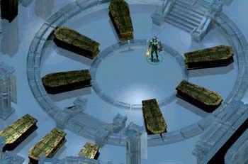 Hier sind einige Särge aufgestellt und der Raum wird von einer grossen Menge Schatten bewacht. Falls man den Kampf gegen diese Wesen scheut, könnten mehrere Blitze nach Süden abgefeuert, die Reihen der Schatten etwas lichten. Wenn die Schatten erledigt sind, sollte man hier nach einem geheimen Durchgang suchen und öffnen. Das ist die einzige Möglichkeit, um später Nathaniels Habseligkeiten zu finden.