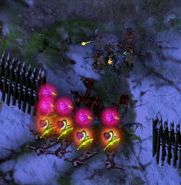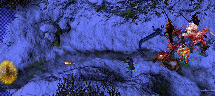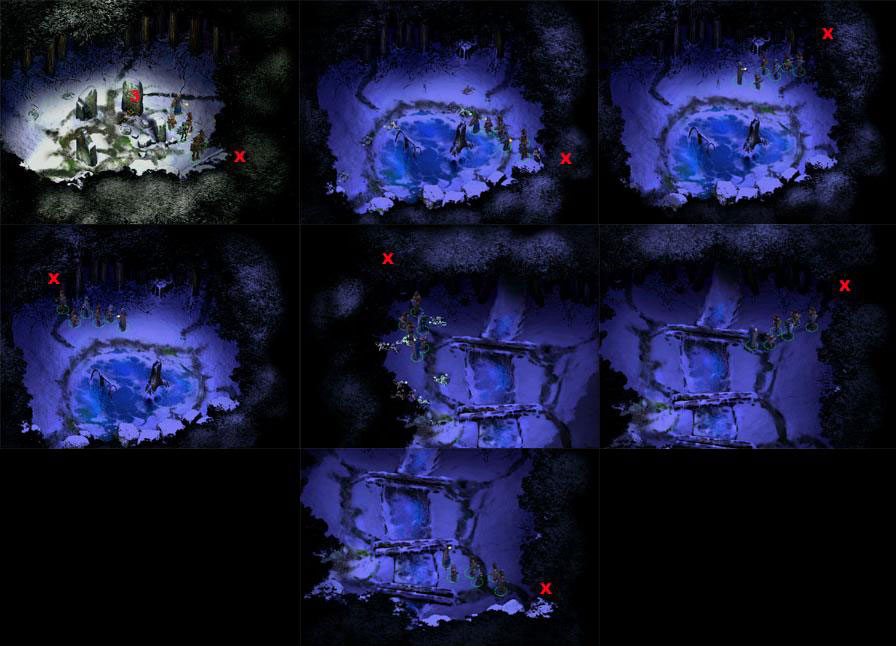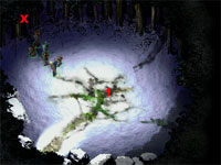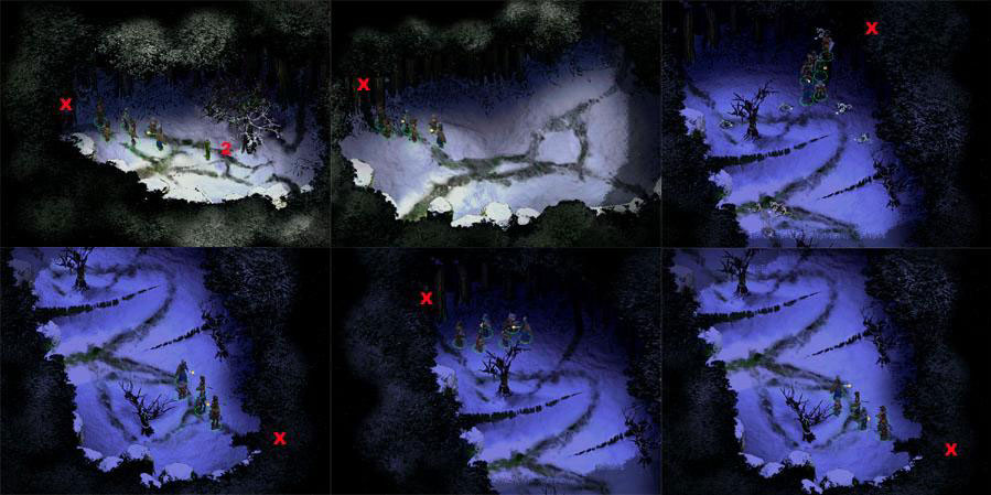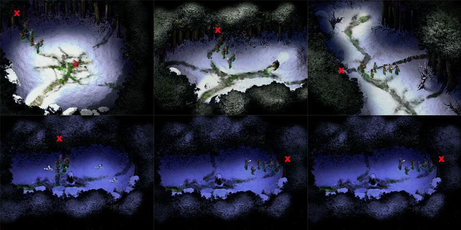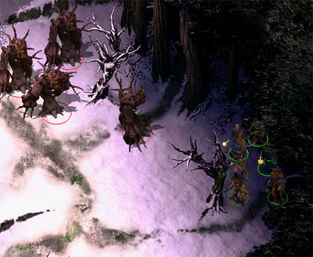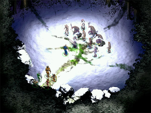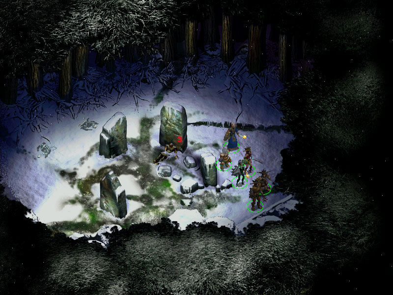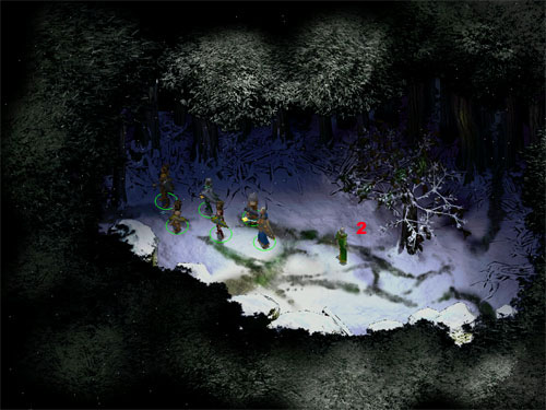 Venla erzählt, dass immer wieder Kinder aus dem Dorf verschwinden. Manche der Dorfbewohner glauben, dass die Kinder sich im Fell Wood verlaufen haben und einer Dryade oder Nymphe zum Opfer fielen. Wir beginnen die Suche östlich des Dorfes, ausserhalb des Fell Woods. Hier treffen wir erst mal auf eine grosse Gruppe Schnee Trolle, die von Troll Schamanen unterstützt werden. (1) Der Kampf ist ziemlich schwierig, da die Schamanen alle Sorten von Immunitäten auf ihre Kumpels zaubern und natürlich auch sämtliche bekannten Sprüche vom Stapel lassen, die unserer Gruppe stark behindern.