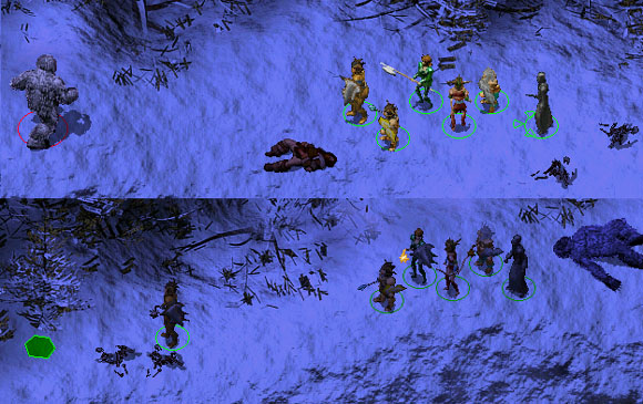 Eine Horde Schneetrolle hat hier ihr Lager (2) aufgeschlagen und greifen in grossen Gruppen an. Mit etwas Glück kann man sie mit Netz aufhalten und Flächenzauber wie Feuerball, Cloud Kill. Stinking Cloud einsetzen. Falls man schon ?Shroud of Flame' im Zauberrepertoire hat, ist das eine gute Methode, den Trollen einiges an Schaden zuzufügen. Auch Call Lightning ist hilfreich, sowie Magic Missiles, um die Troll Schamanen beim zaubern zu unterbrechen.