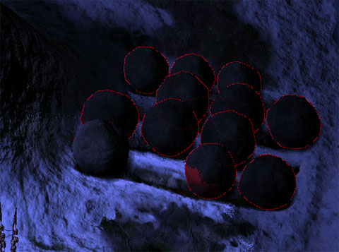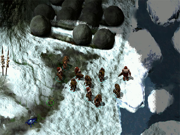 Wenn wir dem Weg in Richtung Flusshöhlen folgen, stossen wir unweigerlich auf eine grosse Gruppe Barbaren, die um Hadbruki geschart sind. (4) Sie bewachen einen Durchgang, der durch Felsbrocken blockiert ist. Eine friedliche Lösung scheint nicht möglich zu sein, so dass es hier auch zum Kampf kommt. Ist erst mal die erste Gruppe geschlagen, kann man sich dran machen, die Felsbrocken aus dem Weg zu rollen. Aber Vorsicht! Bei jedem bewegten Stein ertönt ein Horn und eine weitere Abteilung Barbaren erscheint zur Verteidigung des Durchgangs. Es ist ratsam, die neu aufgetauchten Angreifer erst zu besiegen, bevor man den nächsten Felsbrocken bewegt. Die Überzahl der Barbaren dürfte einen in Schwierigkeiten bringen, wenn man alle Steine nacheinander verschiebt, um den blockierten Weg frei zu machen.