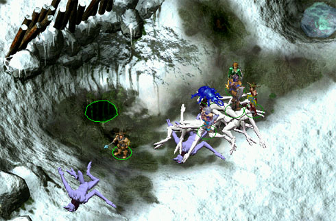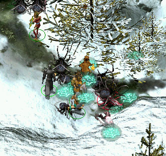 Gleich wenn wir in diese Gegend kommen, wird ein Fehltritt Fallen auslösen welche Netze um die Gruppe auswerfen. Sofort kommen viele grosse Frost Spinnen und Ettercaps an, um ihren Hunger an den Abenteurern zu stillen. (1) Eine Möglichkeit sich hier zu verteidigen ist, sich erst gar nicht zu bewegen, sondern auf beide Wege einige Monster zu beschwören, die dann als Blocker gegen die Spinnen dienen können. Wenn erst mal alle diese Spinnen erledigt sind, und man den Wegen folgt, trifft man schon auf die nächsten Gegner.