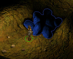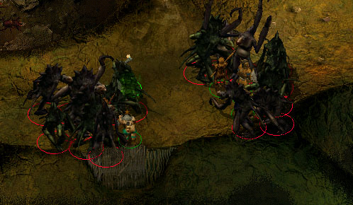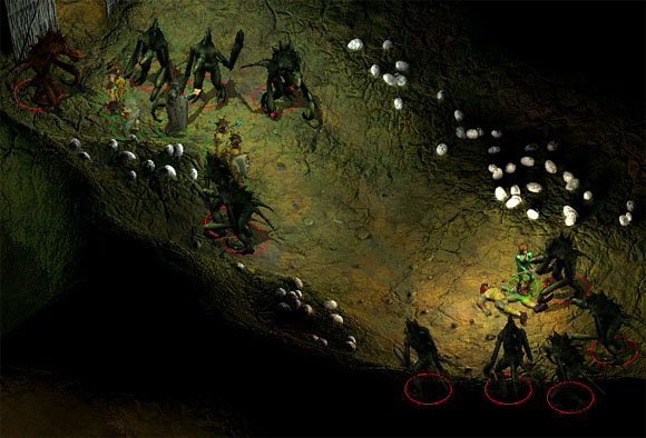 Bei weiterer Erkundung der Höhle sehen wir einige verschlossene Höhlenabteile. (2) Bevor wir hinter die Tore schauen können, greift schon die nächste Gruppe Hook Horrors an. Auch diesmal in grosser Überzahl und von zwei Seiten. Wenn die Gruppe sich noch nicht vom vorhergehenden Angriff erholt hat, dürfte dieser erneute Angriff ziemlich eng werden. Hat man diese Kämpfe erfolgreich hinter sich gebracht, sollte man erst mal für ausreichend Heilung sorgen, denn es ist noch nicht überstanden.