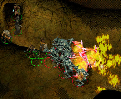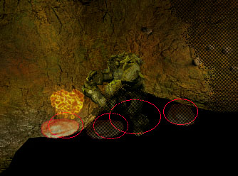 Bei einer weiteren Untersuchung der Höhlengänge, finden wir einen kleinen Durchgang in der Höhlenwand. (4) Da kein anderer Weg weiter führt, kriechen wir vorsichtig hindurch. Auf der anderen Seite werden wir von einer Horde Eistrolle in Empfang genommen. Ein gut plazierter Feuerball und Shroud of Flame dürfte hier am hilfreichsten sein. Der Schaden, den die Gruppe durch Shroud of Flame erleidet, falls es von den Trollen übergreift, ist ungleich geringer, als durch einen langen Kampf gegen die Trolle.
