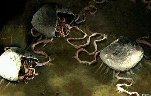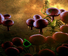Wir bekämpfen alle Drider, die sich aus den schmalen Gängen nähern und angreifen. Südlich der Eingänge treffen wir auf mehrere Myconiden, die hier ihr Lager haben. Zwischen modrigen Pilzen und den Überresten einiger der riesigen Spinnen finden wir ein kleines Versteck, wo der blaue Stein von Oinchack'olp zu finden ist. Dieser Stein verleiht dem Träger +2 auf Weisheit.