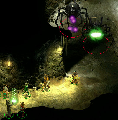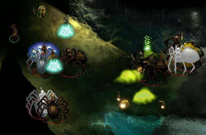 Zu den Driderhöhlen führen drei Eingänge. Gleich nach betreten der Höhlen durch den oberen Eingang, finden wir eine Falle. Kaum ist diese entschärft, tauchen auch schon die ersten Drider auf. Es gibt verschiedene Sorten von ihnen. Drider Priestress, Viciscamera Drider Wizard und Priestress, und Drider Fighter. Wie bereits angetönt, können diese Drider alle zaubern. Deshalb sollte man sich dementsprechend vorbereiten und einige Monster beschwören, für den Fall dass die eigenen Gruppenmitglieder gerade in einem Netz hängen oder anderweitig indisponiert sind.