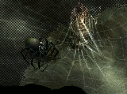 Schliesslich untersuchen wir die verschiedenen Gänge in der Höhle, um sicherzustellen, dass wir alle Drider erwischt haben. In einem Raum voller Spinnennetze und einer eigenartigen Statue treffen wir auf Ginafae Despana. Wenn wir hier schon alles erledigt haben, können wir sie beruhigt zu ihrem Bruder Malavon im Drowlager schicken.