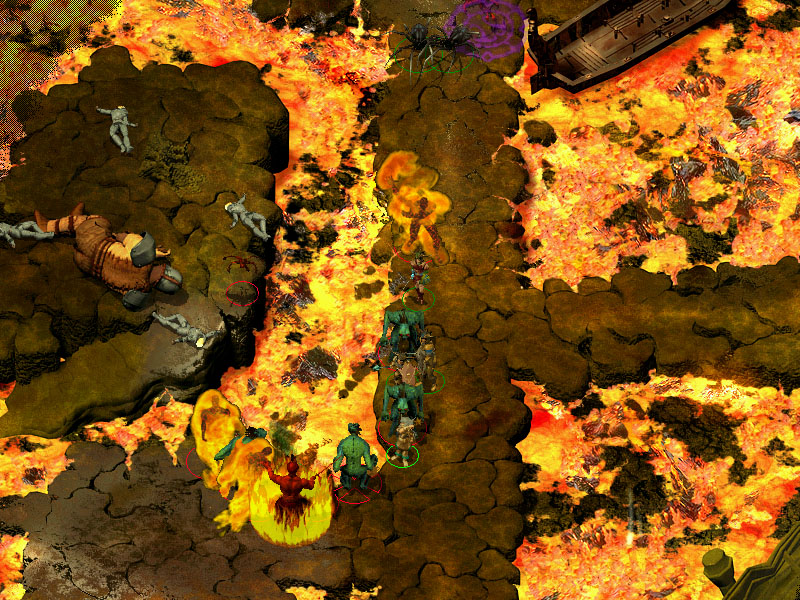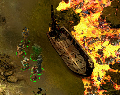 Interessant wird es beim Amphitheater. Hier lassen wir uns ein Spiel der Flamewalkers zeigen. Gegen Ende der Vorführung werden wir Zeuge, wie King Lothar Izbelah umbringt, indem er sie in die glühende Lava stösst. Nach diesem Vorfall begeben wir uns zum Guard Post und auf dem Weg zu King Lothar hören wir ein Gespräch zwischen diesem und Inquisitor Venomin. Leider werden wir beim Lauschen erwischt. Jetzt kommt es entweder zum Kampf oder wir verabreichen der ganzen Gruppe (sofern vorhanden) einen Sanctuary-Trank. Denn unter dem Schutz von Heiligtum können wir wieder zum Boot fliehen und so dem Kampf aus dem Weg gehen. Mit dem Boot lassen wir uns wieder zum Ausgang, sprich Fields of Slaughter' fahren.