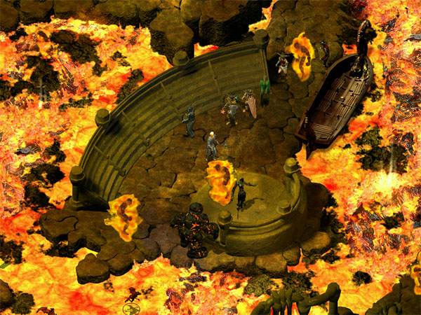 Wir folgen weiter dem Weg in die einzig mögliche Richtung, bis wir an den Geröllhaufen gelangen, der uns vorhin aufhielt. Hier gibt es eine Möglichkeit das schmale Felssims zu verlassen. Hier treffen wir auf Archon, der so eine Art Fährdienst unterhält. (2) Sein Boot fährt nicht im Wasser, sondern ist in der Lage uns über die glühende Lava zu transportieren. Allerdings sind die Fahrkarten auch entsprechend teuer. Eine Fahrt pro Person kostet 300 Goldstücke. Das macht bei einer 6er-Party volle 1'800 Goldstücke pro Fahrt. Das wird dann schnell ein teurer Spass, wenn man sich hier sinnlos in der Gegend umher gondeln lässt.