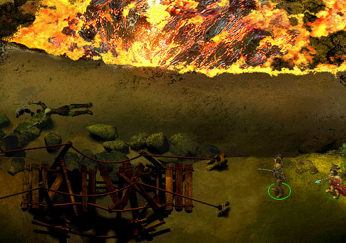 Trockene, heisse Luft schlägt uns entgegen, als wir die unterste Etage der Dragon Eye-Höhlen betreten. Bevor wir uns richtig orientieren können erscheint vor uns ein Cornugon, welcher sofort angreift. Wenn wir den Weg nach links wählen, werden wir sehr bald von Geröll aufgehalten. Also begeben wir uns auf die rechte Seite. Hier hält uns lange nichts auf, bis wir auf eine ziemlich stark beschädigte Brücke stossen. (1) Die Brücke kann repariert werden, sofern man mindestens vier Hanfseile dabei hat. Diese Seile können alle in den oberen Etagen des Dragon Eye's gefunden werden.