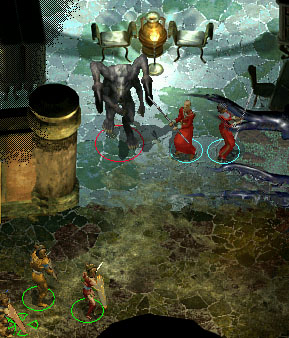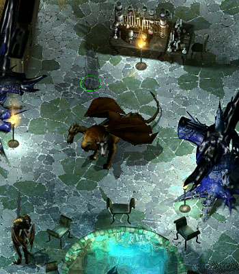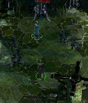 Bei der Erkundung von der zweiten Etage, werden wir unfreiwillig als Testobjekte benutzt. Zwei Magier erbitten unsere Hilfe gegen ein dämonisches Construct. (6) Der Kampf ist erstaunlich einfach. Trotzdem werden wir es nicht schaffen, die Aufmerksamkeit der beiden Magier zu wecken oder uns in ihr Gespräch einzumischen, was zur Folge hat, dass sie schliesslich einfach verschwinden. Dafür finden wir hier ein paar Gegenstände, die später noch sehr nützlich für uns sein werden. Vor allem das 'Tainted Demon Blood' wird uns noch gute Dienste leisten. Auch das Tagebuch von Garuk Katah könnte sich als hilfreich erweisen. In den Behältern in diesem Raum gibt es sonst noch eine feine Magierrobe und einige Spruchrollen zu finden.