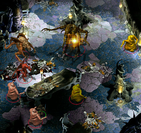 In dem Raum gleich neben der Treppe, unterhält sich Yxbudr'zmutkimdu mit Pfinik'millillin und Tutup'limbobo, (1) bis er unsere Anwesenheit bemerkt. Denn sobald wir entdeckt werden, dauert es nicht lange, bis ein Kampf beginnt. Die Lemuren Sklaven stellen keine grosse Gefahr dar. Ein guter Schütze und einige beschworene Monster sollten sich um diese kümmern. Die Hauptstreitmacht der Gruppe sollte sich hauptsächlich auf die drei Ausgeburten der Hölle konzentrieren. Diese Monster müssen wir besiegen, wenn wir das ?Bonding Agent' aus dem hinteren Raum holen wollen, welches wir im Labor benötigen.
