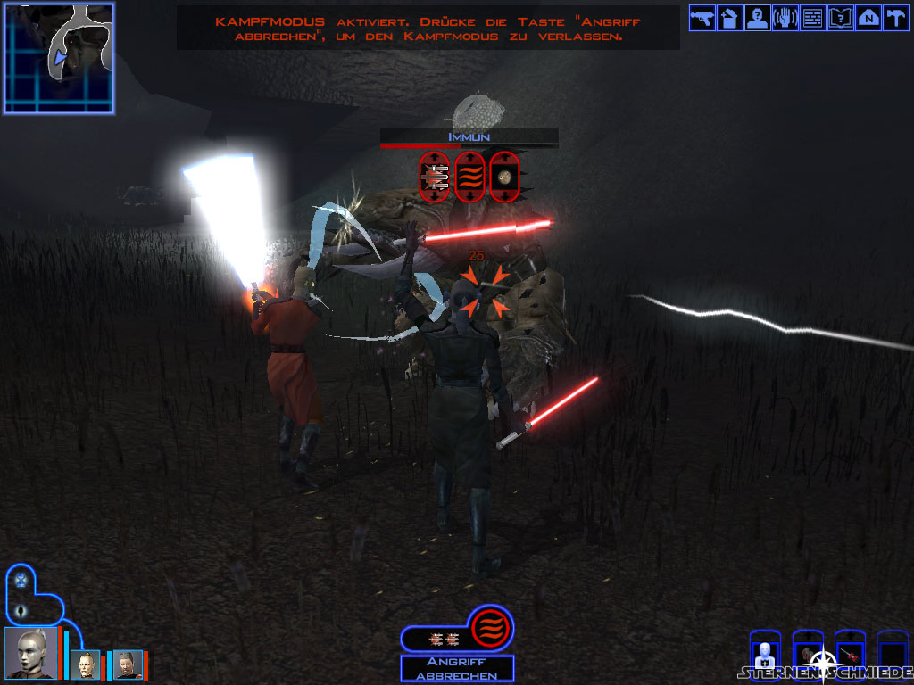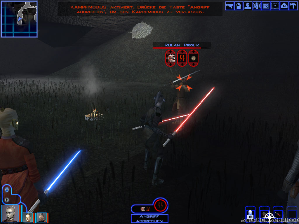 Im Südwesten des östlichen Zentrums (14) wartet Hulas wie angekündigt auf euch. Wie von Senni angeraten, solltet ihr ihn aber nicht mit Begleitung ansprechen. Er würde sich lediglich dumm stellen. Entlasst also eure Gruppenmitglieder und redet mit Hulas. Er gibt euch daraufhin eine kurze Einleitung zum Einsatzgebiet der Genoharadan. Nachdem er euch von den ersten Belohnungen erzählt hat, stellt er euch zwei mögliche erste Opfer zur Auswahl: Lorgan (auf der gleichen Karte (3)) und Zuulan Sentar (auf Dantooine). Zur Aufnahme in die Kopfgeldjägergilde braucht ihr selbstverständlich nur einen der beiden erledigen. Falls es euch nach Erfahrungspunkten und Belohnungen gelüstet, könnt ihr natürlich beide töten.