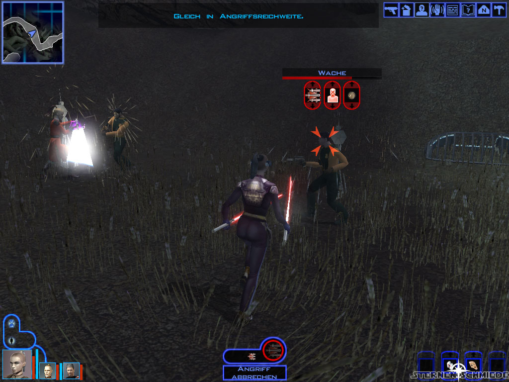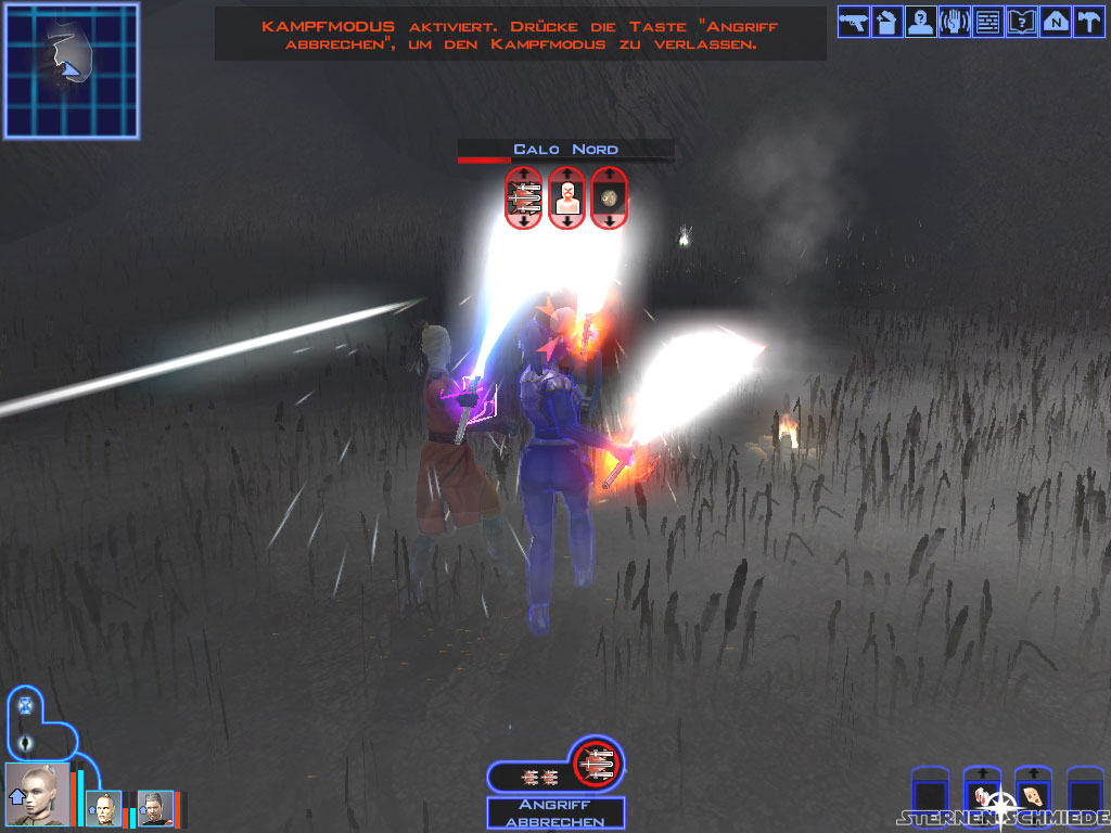 Da Carlos Handlanger nur mit sehr schwachen Blastern ausgerüstet sind, empfiehlt es sich dieses mal, die ersten Angriffe auf Carlo selbst zu konzentrieren (650 XP). Laserschwerter sind durch sein Schild wenig effizient. Bombardiert ihn daher entweder mit Granaten und Blastern oder benutzt eine Vibroklingenwaffe. Anschließend könnt ihr den Rest der Gruppe erledigen. In Carlos Überresten findet ihr u.a. eine schwere Mandalorianische Pistole, Calo Nord's Kampfanzug und über 2000 Credits. - Darth Brandon