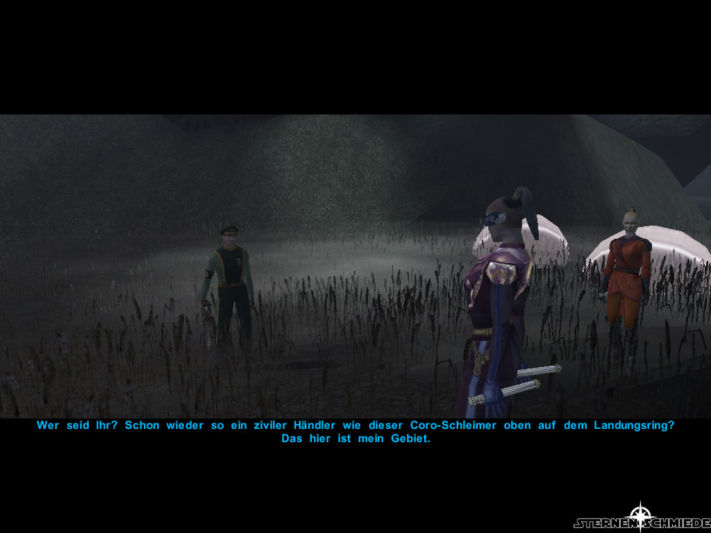 Geht den Weg nach Norden zurück und nehmt an der zweiten Abzweigung den Nordöstlichen Weg. Hier steht euch eine neue Gruppe Katarns im Weg. Am Anfang der Nordöstlichen Abzweigung liegt eine Wookie Leiche, welche zur verschwundener Wookie Quest gehört. Interessanter ist im Moment jedoch die Leiche, welche in nordwestlicher Richtung liegt. (Auf dem Weg zur Lichtung, bei der Jolee kämpfte.) Bei ihr findet ihr einen Zabrak Kampfanzug und ein Ionengewehr. Im Anschluss daran geht es endlich weiter zu den Czerka Jägern (zur Abzweigung zurück und von dort aus nordöstlich). Passt auf die Minen auf. Kommandant Dern gibt sich von Anfang an unfreundlich. Er droht, euch umzubringen, wenn ihr seiner Profitgier in die Quere kommt. Als böser Charakter solltet ihr euch diese Chance natürlich nicht entgehen lassen. Aber es gibt auch andere Wege: