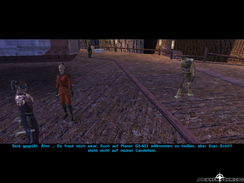 Obwohl es eigentlich nicht nötig ist, bevorzuge ich Zaalbar in der Gruppe zu haben. Schließlich ist es seine Heimatwelt. Aber selbstverständlich gibt es weitaus effektivere Gruppenmitglieder als ihn. Sucht euch also aus, wen immer ihr wollt. Im Gegensatz zu den bisherigen Planeten, funktioniert das Transitsystem auf diesem Planeten nicht, womit ihr auch eure Gruppenmitglieder nicht wechseln könnt. D.h. ihr müsst jedes mal selbstständig zu dieser Karte zurücklaufen. Beim Verlassen des Schiffes werdet ihr von Janos Wertka, einem Mitarbeiter der Czerka Corporation, aufgehalten. Wie auf den anderen Planeten, welche von der Czerka Corporation in Beschlag genommen wurden, müsst ihr hier eine Andockungsgebühr von 100 Credits entrichten. Natürlich könnt ihr ihn (mit der Macht) davon überzeugen, dass die Gebühr bei euch nicht nötig ist. Ferner befragt er euch, ob ihr einen Übersetzer benötigt. Was ihr dankend ablehnen könnt. Daraufhin bittet er euch, ihm zum Informations-Center zu folgen.