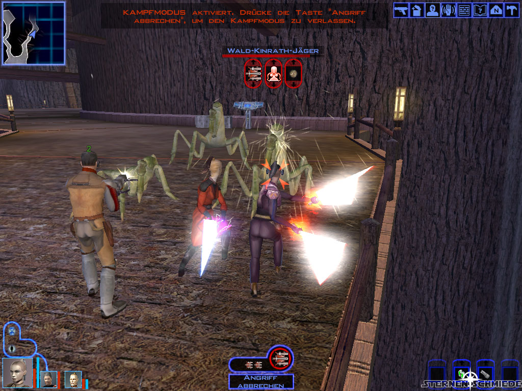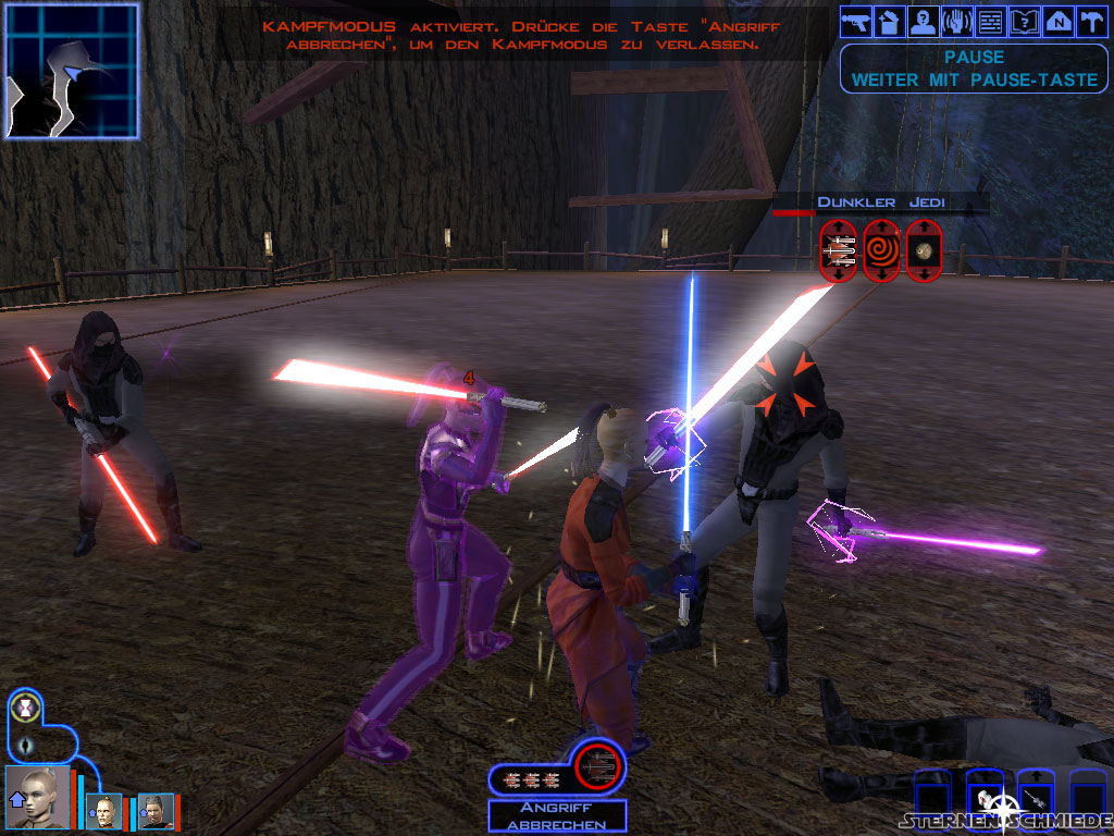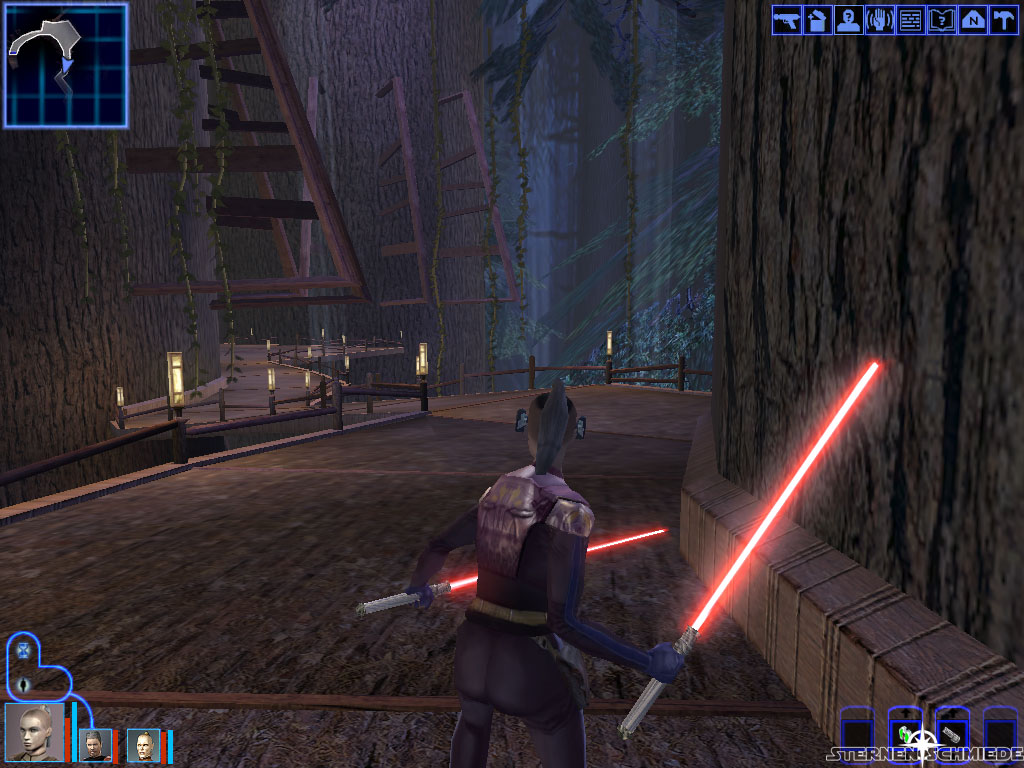 Setzt euren Weg nach Norden fort bis ihr zum nächsten großen Gebiet kommt. Hier erwarten euch 3 Dunkle Jedi! Einer der Dreien hält sich für gewöhnlich im Hintergrund, während die anderen beiden auf euch einprügeln. Aus meiner Erfahrung ist der Hintere die größere Gefahr, da er im Gegensatz zu den anderen nur seine Spezialtalente einsetzt. Daher bevorzuge ich es, dem Hinteren als erstes die Lichter auszublasen und die Schwerthiebe vorübergehend zu ignorieren. Jeder des Trios ist 200 XP wert und in ihren Überresten findet ihr zahlreiche Kristalle, Schilde, Laserschwerter und Dunkle Jedi Roben.