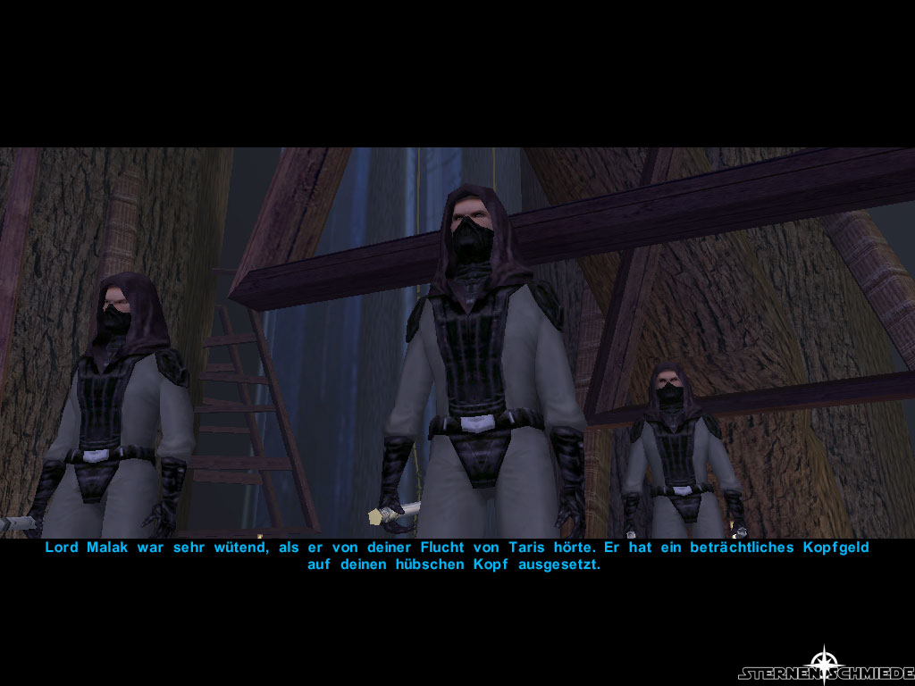 • Sollte Kashyyyk euer 2. Sternenkartenstück (Dantooine mitgerechnet) sein, so wird Darth Malak darüber informiert, dass die Sternenschmiede jetzt mit 200% läuft. Er ist jedoch mehr daran interessiert, wie es Bastila gelungen ist, Taris zu entkommen. Woraufhin Admiral Karath ihm den tot geglaubten Kopfgeldjäger Carlo North vorstellt. Da Carlo den Auftrag erhält, Bastila und euch zu jagen, dürft ihr drei mal raten, wer euch auf Kashyyyk begegnen wird.