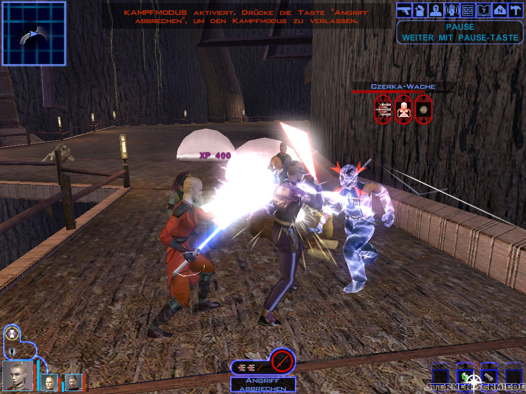 Stachelt Zaalbar an, in dem ihr sagt, ihr könntet darauf wetten, dass ihn das verrückt macht. Daraufhin bietet er an, sie zu töten. Stimmt ihm zu und ihr findet euch in einem kleinen Kampf wieder. Für die Tat gibt es DM Punkte, sowie 250 XP pro Wache und 350 für den Captain. Außerdem findet ihr bei ihren Überresten eine Czerka Corp Sicherheitskarte, welche später nützlich wird.
