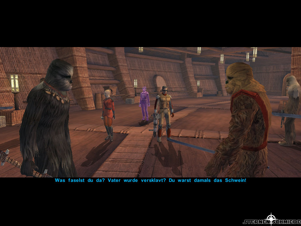 Nach der Plünderung wird es Zeit für ein Gespräch mit Janos selbst. Fragt ihn nach allem was ihr wollt. Er verfügt übrigens auch über eine reichhaltige Equipmentauswahl. Durch die zur Auswahl stehenden Fragen, erfahrt ihr genaueres über die Sklavengeschäfte auf dem Planeten. Komischerweise scheint es eine Art Zustimmung der Wookies diesbezüglich zu geben. Überredet ihn mit der Macht oder ohne, damit ihr erfahrt, dass Czerka Waffen im Austausch für gesunde Wookies liefert. In Folge dessen wird der derzeitige Wookie Anführer (Chuundar) in Zaum gehalten, während Czerka gute Profite einstreicht. Wenn ihr Zaalbar in der Gruppe ist, werdet ihr erfahren, dass Chuundar nicht grade der Name war, den er hören wollte. Mehr will er dazu derzeit aber noch nicht sagen.