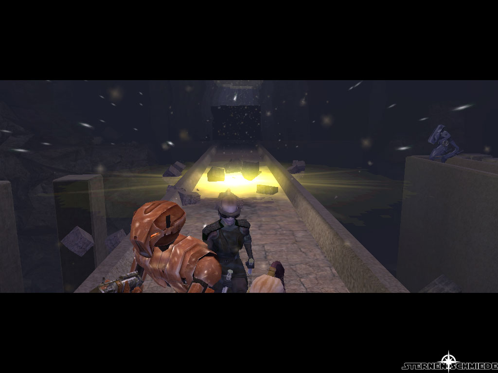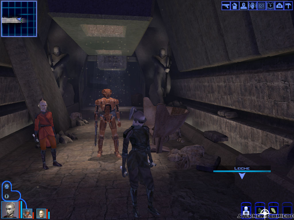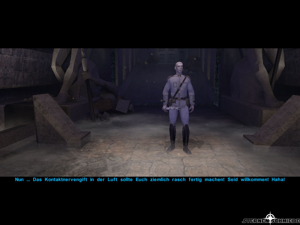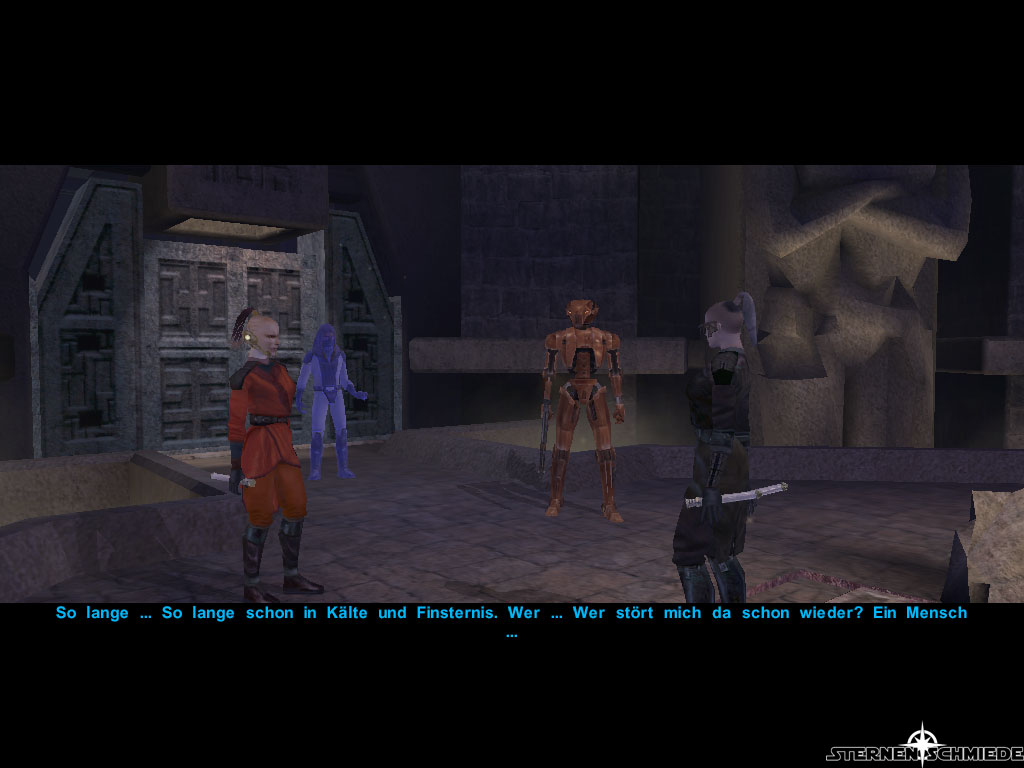 Begebt euch nun hinter den Sarg und wählt die Sith Statue aus. Wählt das gekerbte Stahlschwert aus und redet anschließend wieder mit Ajunta Palls Geist. Er gestattet euch, die Gruft mit seinem Schwert zu verlassen. Falls ihr zur Hellen Seite gehört und gute Überredungskünste besitzt, könnt ihr versuchen, Ajunta Pall wieder zur Hellen Seite der Macht zurück zu bringen. Andernfalls verlasst einfach die Gruft.
