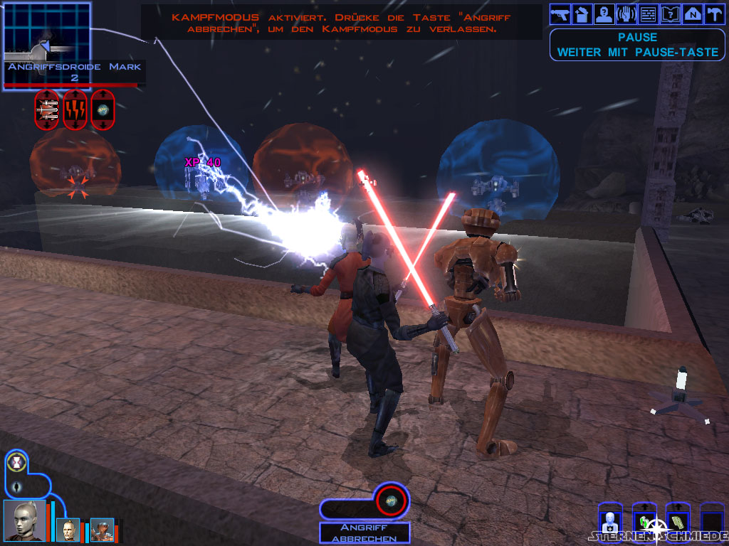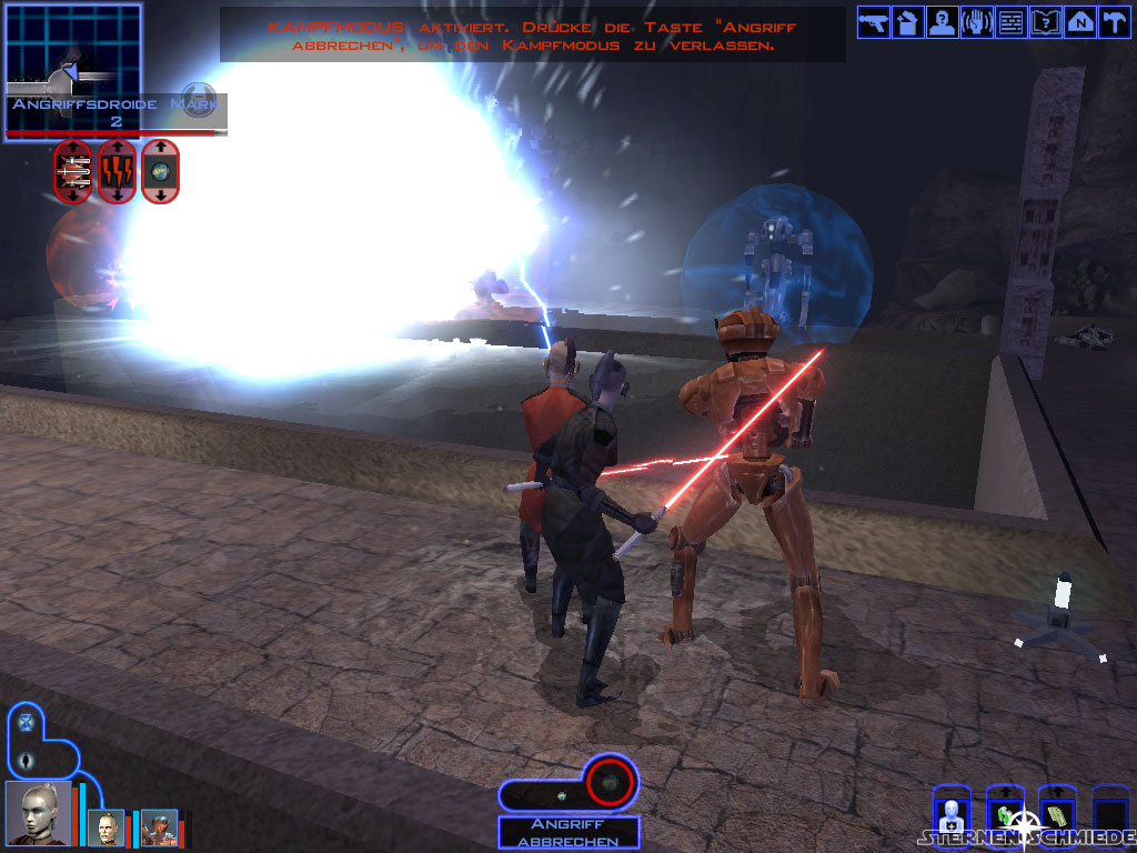Augenblicklich erwachen die Droiden auf der anderen Seite zum Leben. Nutzt alle euch zur Verfügung stehenden Fernwaffen, um sie außer Gefecht zu setzen. Ionen Granaten und die Droide Zerstören Macht wirken selbstverständlich am schnellsten.