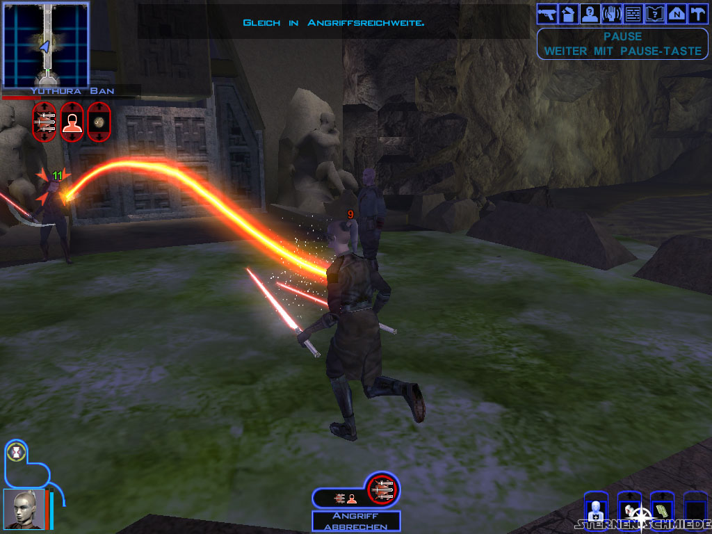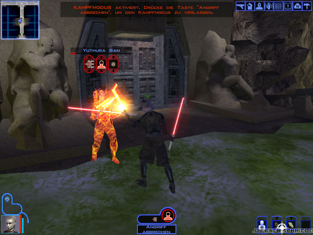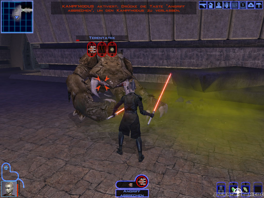 Wie schon draußen, strömen hier ebenfalls unzählige Sith auf euch ein. Die meisten sind jedoch noch Schüler und nicht sonderlich stark. Bahnt euch einen Weg zum Ausgang, verlasst die Akademie in Richtung Ebon Hawk und startet durch zum letzten Planeten.