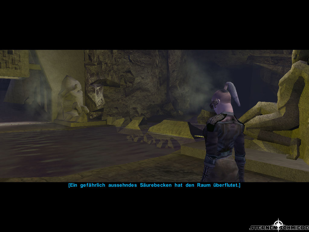 Euer eigentliches Ziel liegt hinter dem Säuresee (an der Kreuzung geradeaus). Um diesen Überqueren zu können, benötigt ihr jedoch eine Granate. Welche ihr in dem Raum am Ende des rechten Ganges findet. Diese wird aber von 2 Terentateks bewacht. (Ihr erinnert euch vielleicht... einer von ihnen hat die Brücke in der Sithrebellenquest bewacht). Da diese recht schwer zu besiegen sind, könntet ihr zunächst den linken und letzten Weg der Kreuzung nehmen. Denn dieser führt zu einem Giftschwert, mit dem der Kampf etwas einfacher wird.
