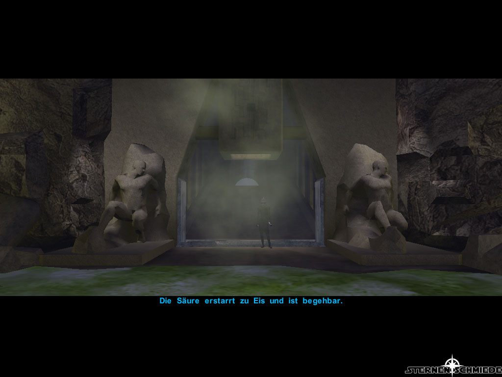 Wenn ihr den Weg hinab lauft und am Säuresee angelangt seit, werdet ihr automatisch gefragt, wie ihr verfahren wollt. Entscheidet euch dafür, die Kältegranate in den Säuresee zu werfen. Somit verwandelt sich die ätzende Masse in einen soliden Block. Überquert in in Richtung Tür. Hinter dieser erwartet euch die Sternenkarte. Außer ihr findet ihr in dem Raum auch noch ein Sith Laserschwert (in der Sith-Statue hinter der Karte).